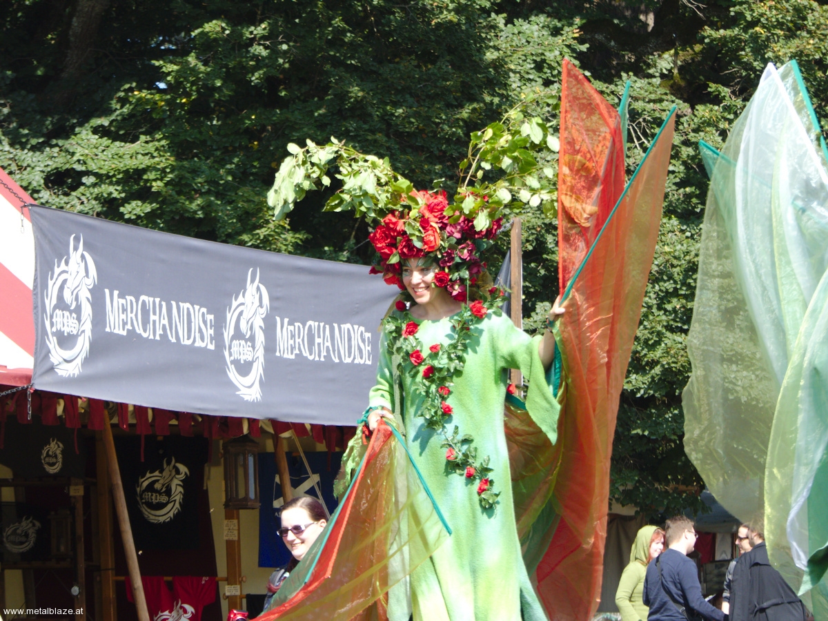 Wir Zählten alleine über 30 Händler die für das Leibliche wohl der mehreren tausend Besucher sorgte. Insgesamt waren gut 100 Marktstände vertreten, von Mytholon aus der Larp Szene bis zum Schmied, bei dem man seine Waffen schmieden lassen konnte, war alles vertreten. Und sollte die Brieftasche mal leer sein, konnte man im eigens aufgestellten „Geldzelt“ schnell mit der magischen Karte Nachschub organisieren, sofern sich da nicht der Bankberater gemeldet hätte. Auch war für die kleinsten mit eigen Mittelalterlichen Fahrgeschäften gesorgt, ebenso wie ein eigens Kinderprogramm. Wobei man schon sagen muss das dieser Markt sich mit 30€ Eintritt eher nicht an die Familie Richtet die eben mal einen Mark besuchen will, sondern eher an jene die auch wegen der Musik kommen. Angesichts der Fülle an Bands aus den Mittelalter ist der Preis mehr als angemessen.